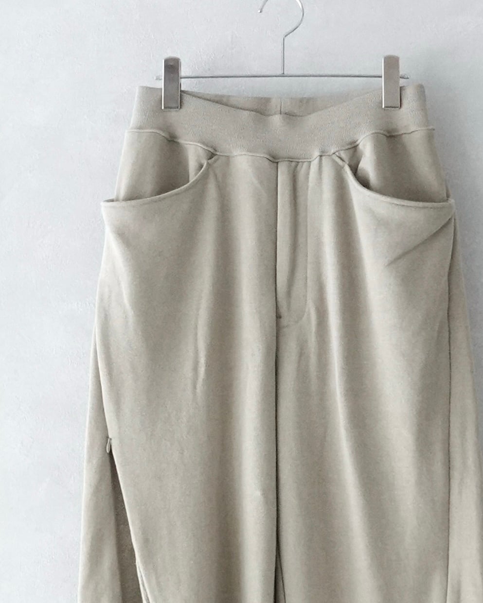 裾はカットオフ、オリジナルで編み立てたウエストリブはゴムで調整可能なイージー仕様。