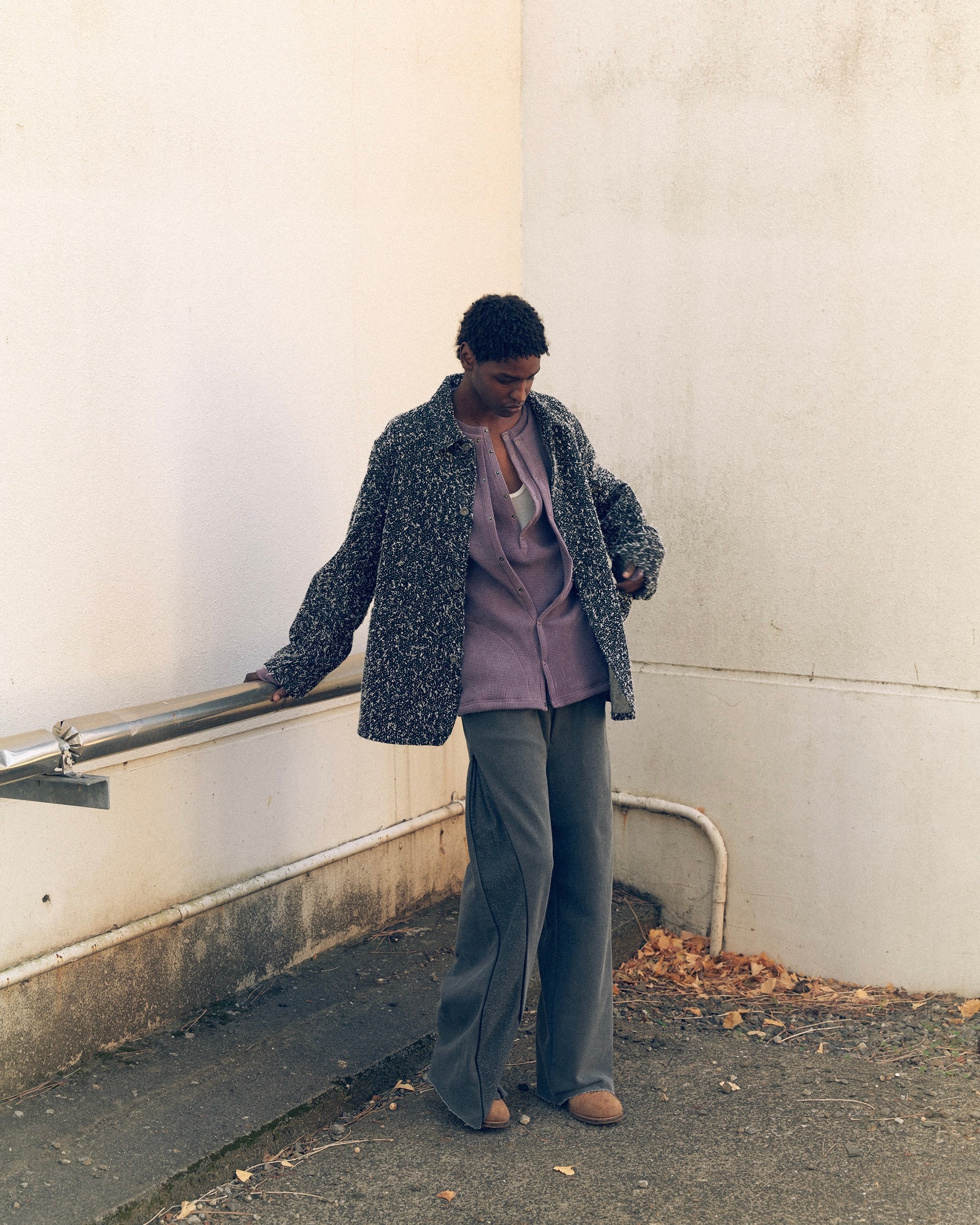 スラックスのディテールにスウェットパンツの抜け感が相まった逸品です。