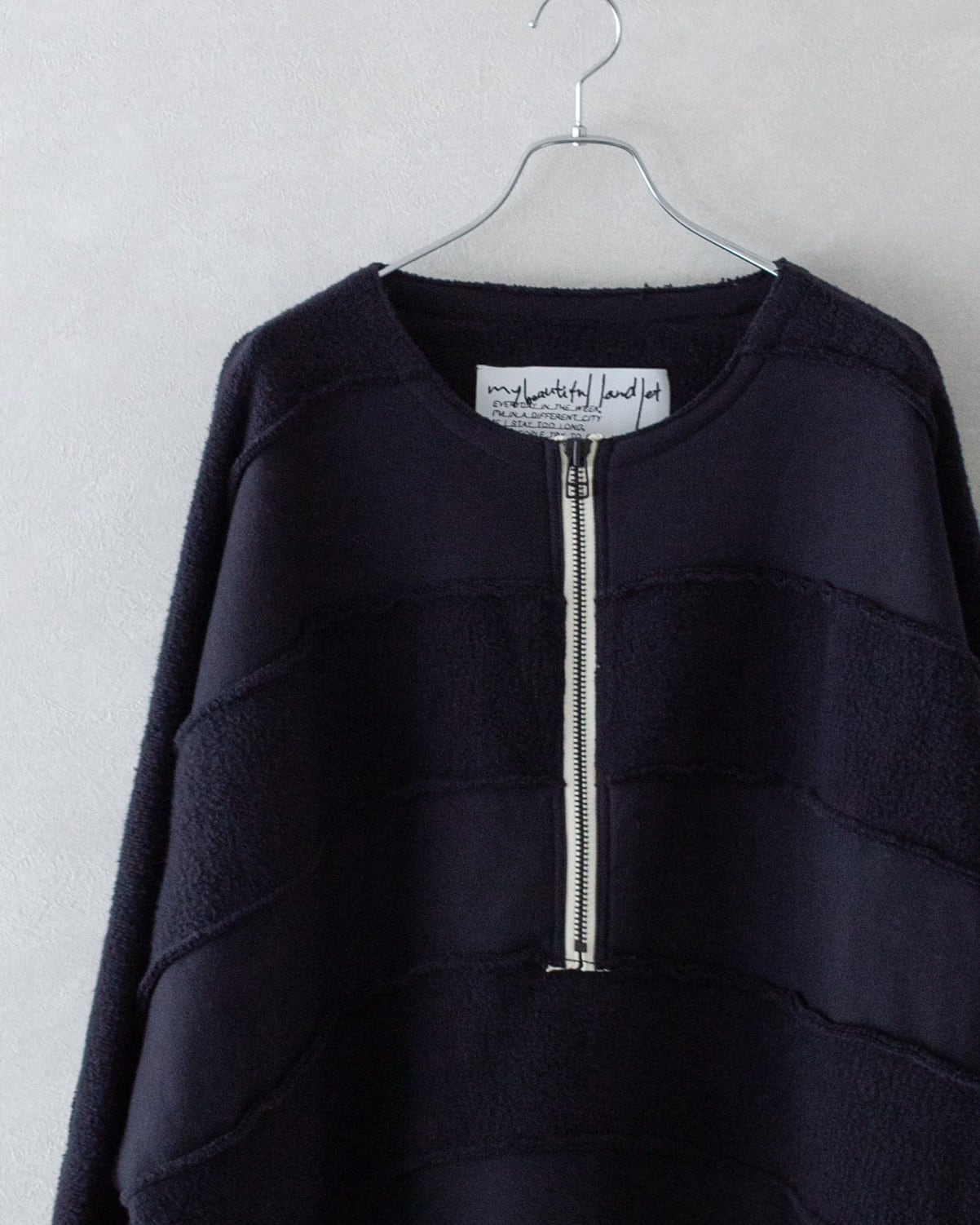 深めのハーフジップ、ボーダー柄に切り替えられたデザインが最大の特徴です。