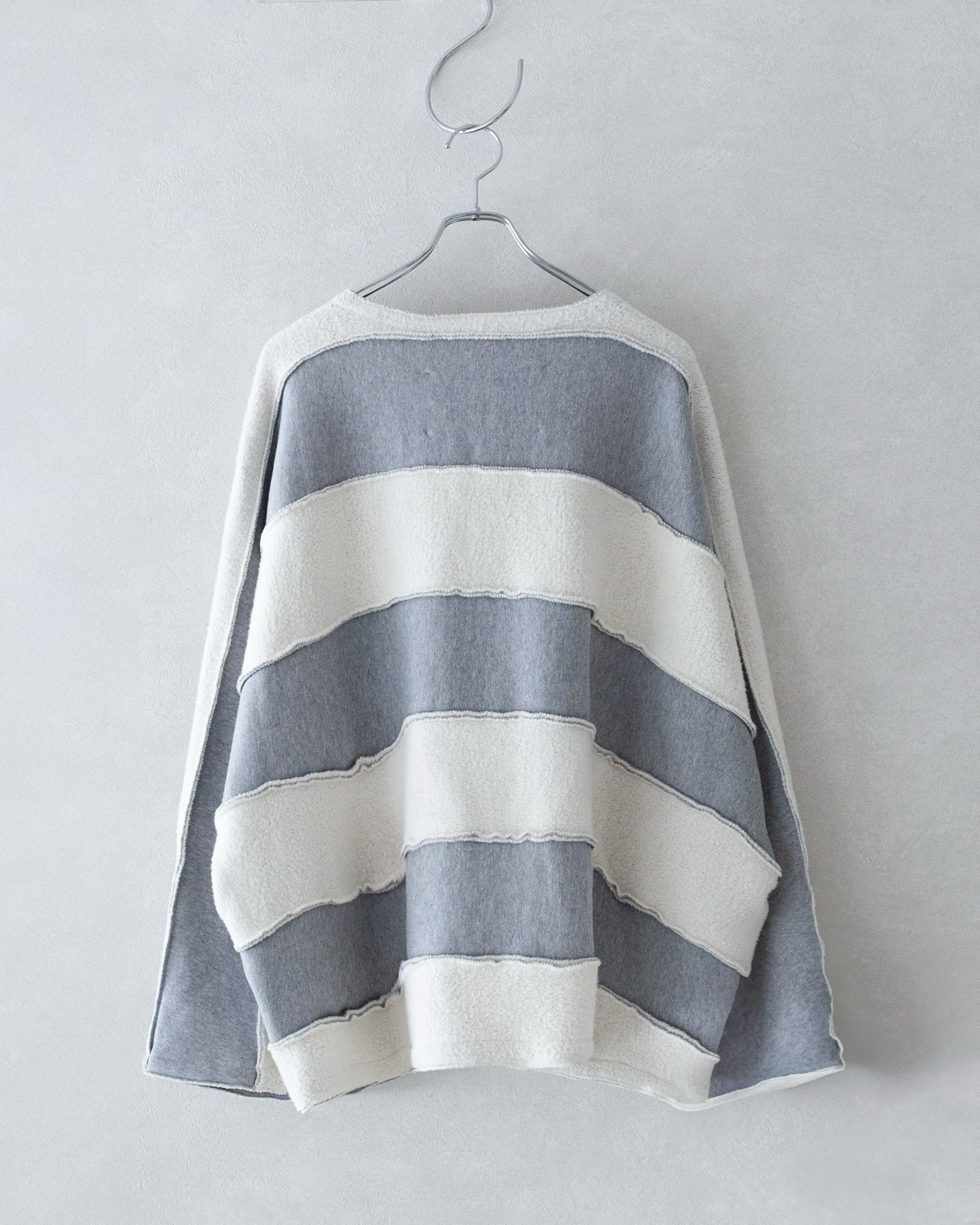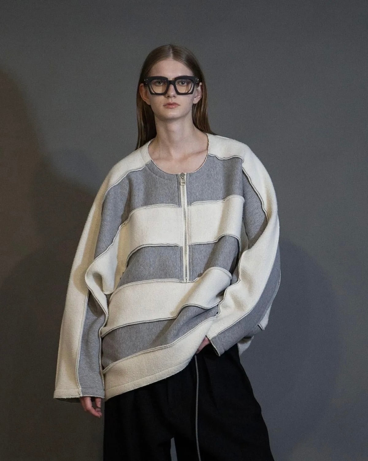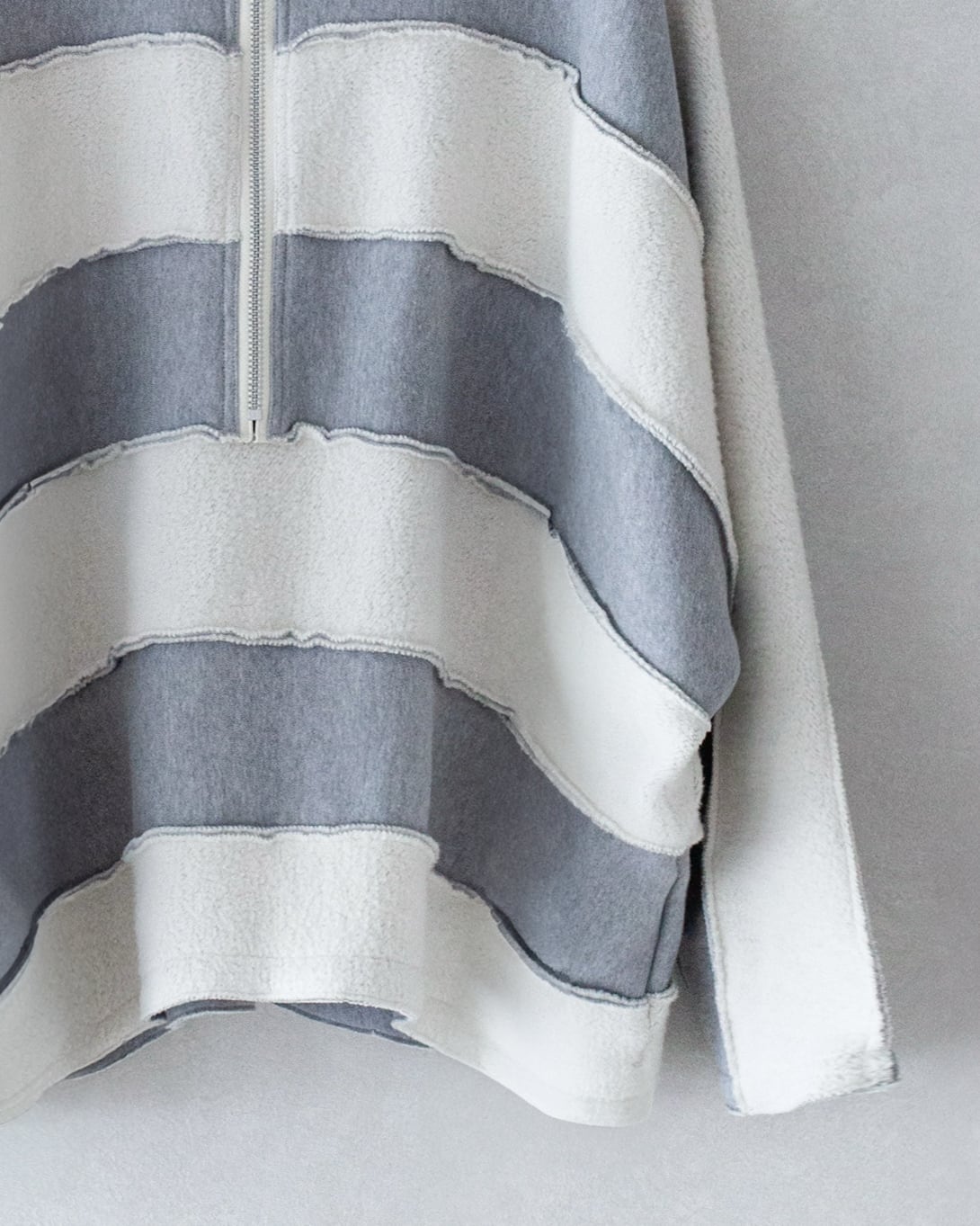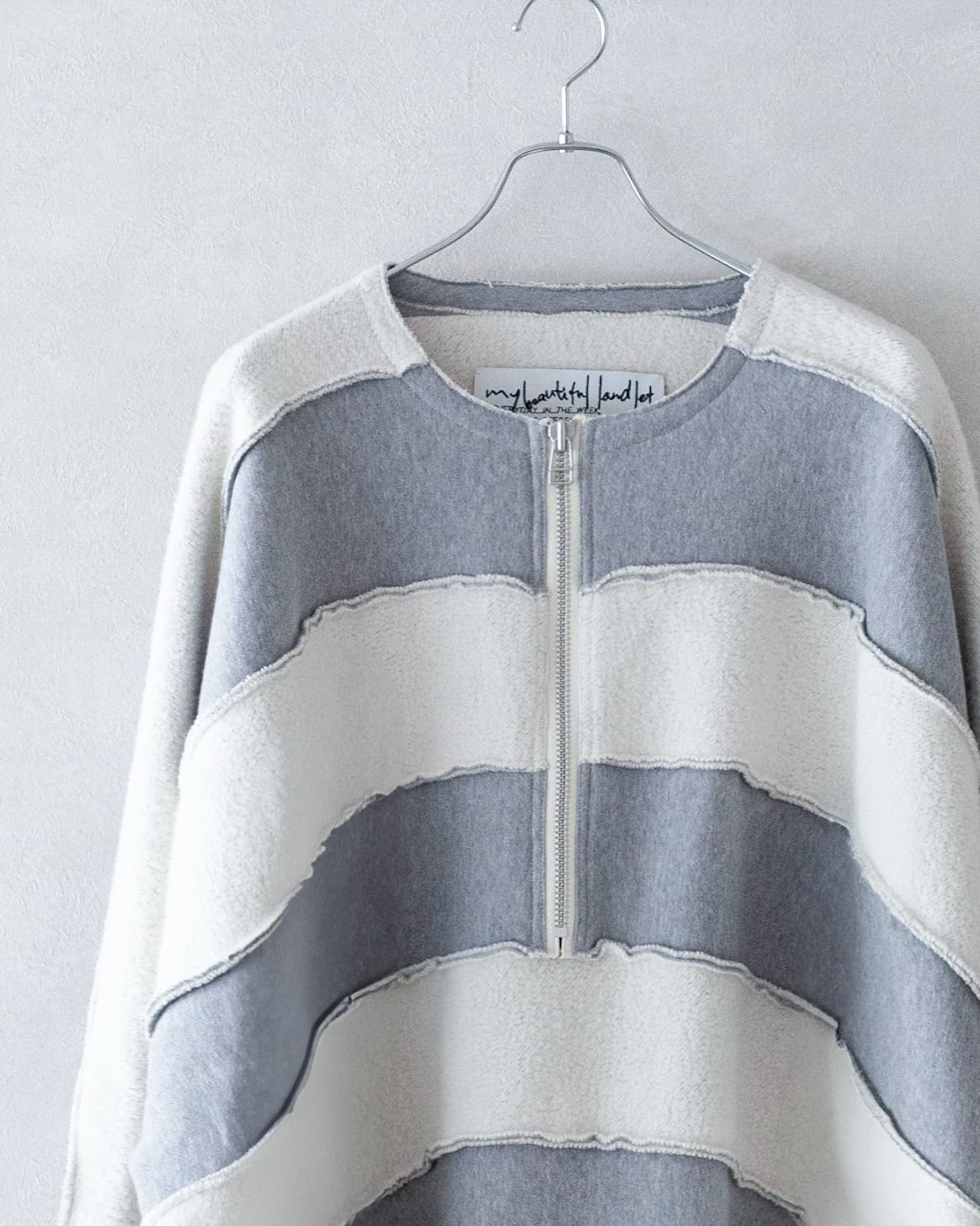 深めのハーフジップ、ボーダー柄に切り替えられたデザインが最大の特徴です。