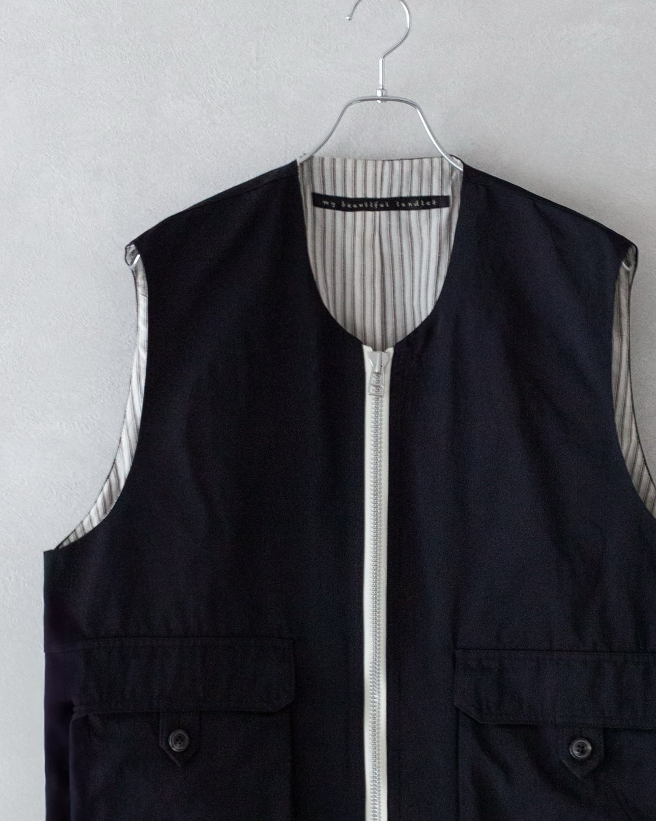 ベストでは珍しい、立体的でまるみがあるオーバーシルエットで、ジャケットやコートなどのアウターとのレイヤードスタイルもお薦めです。