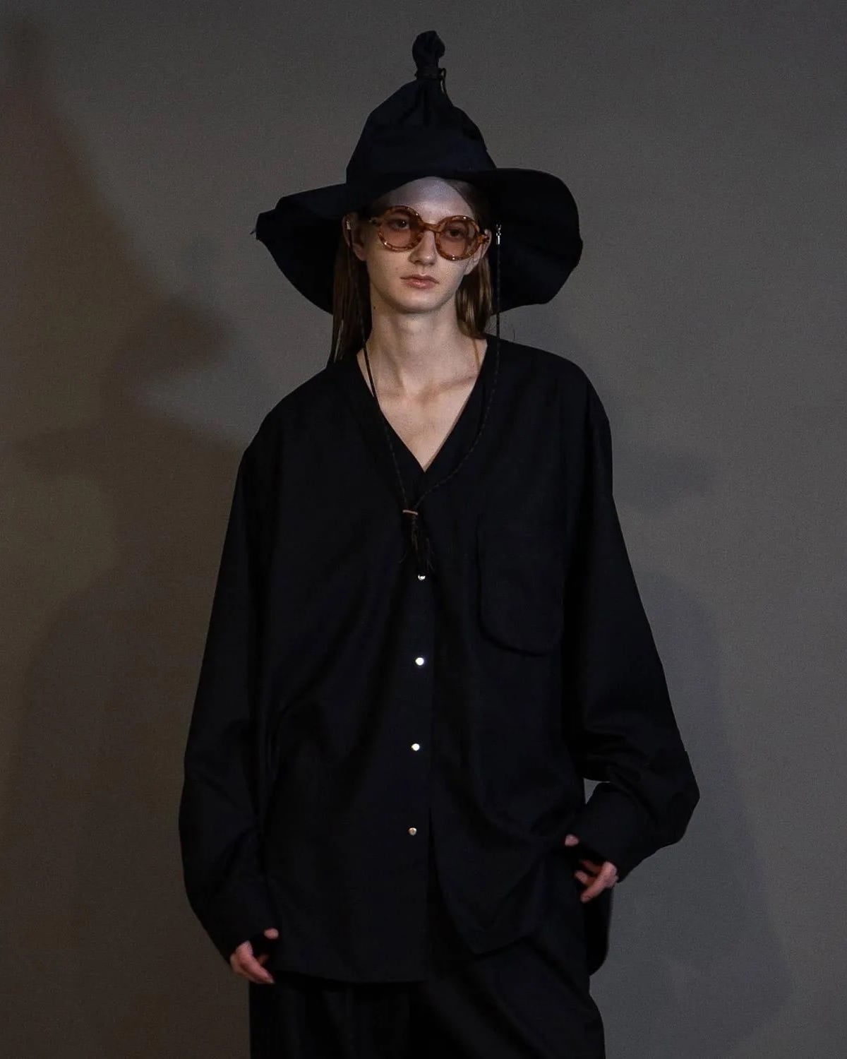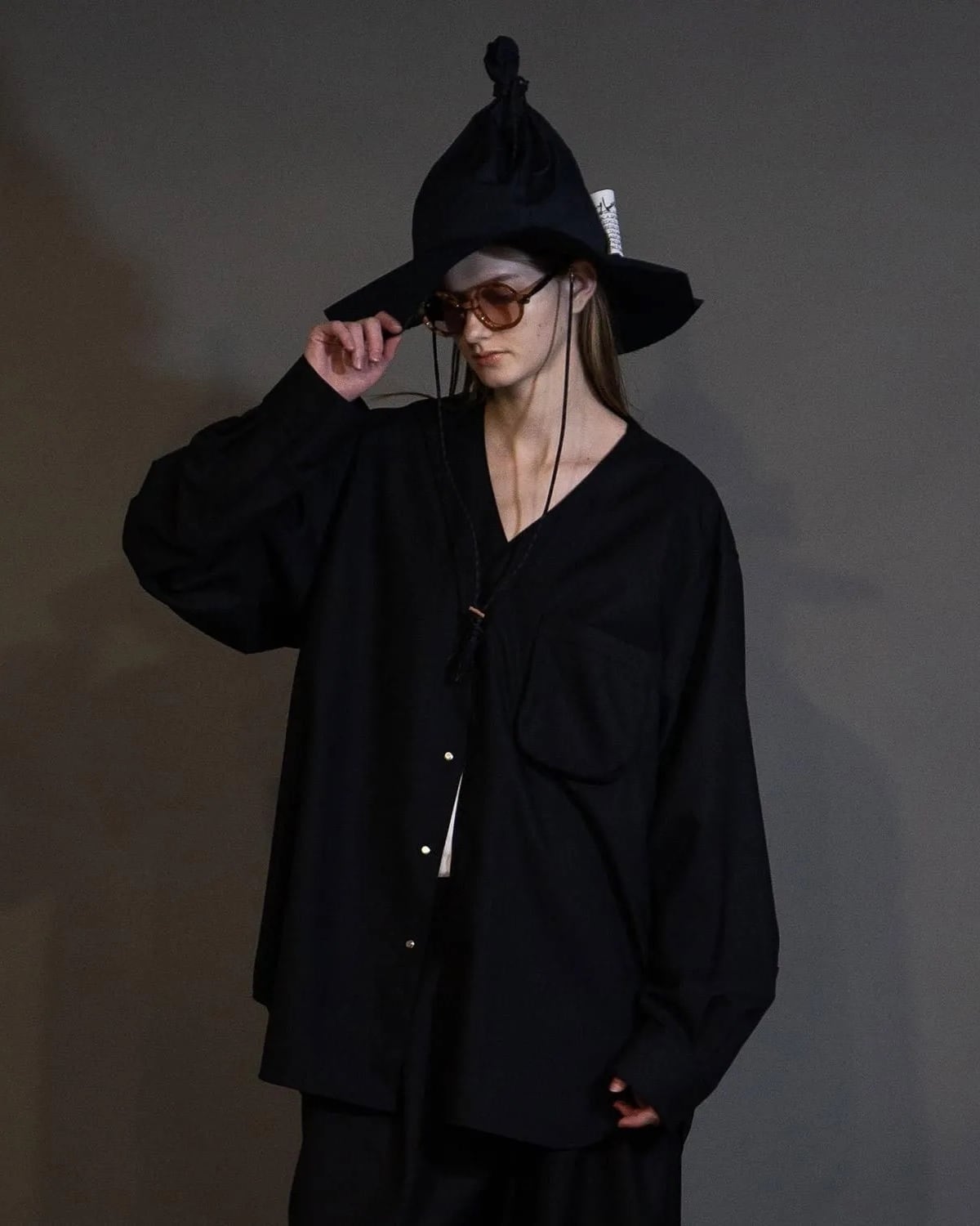 すっきりとした襟周りのノーカラー仕様がレイヤードスタイルを彩るシャツジャケット。