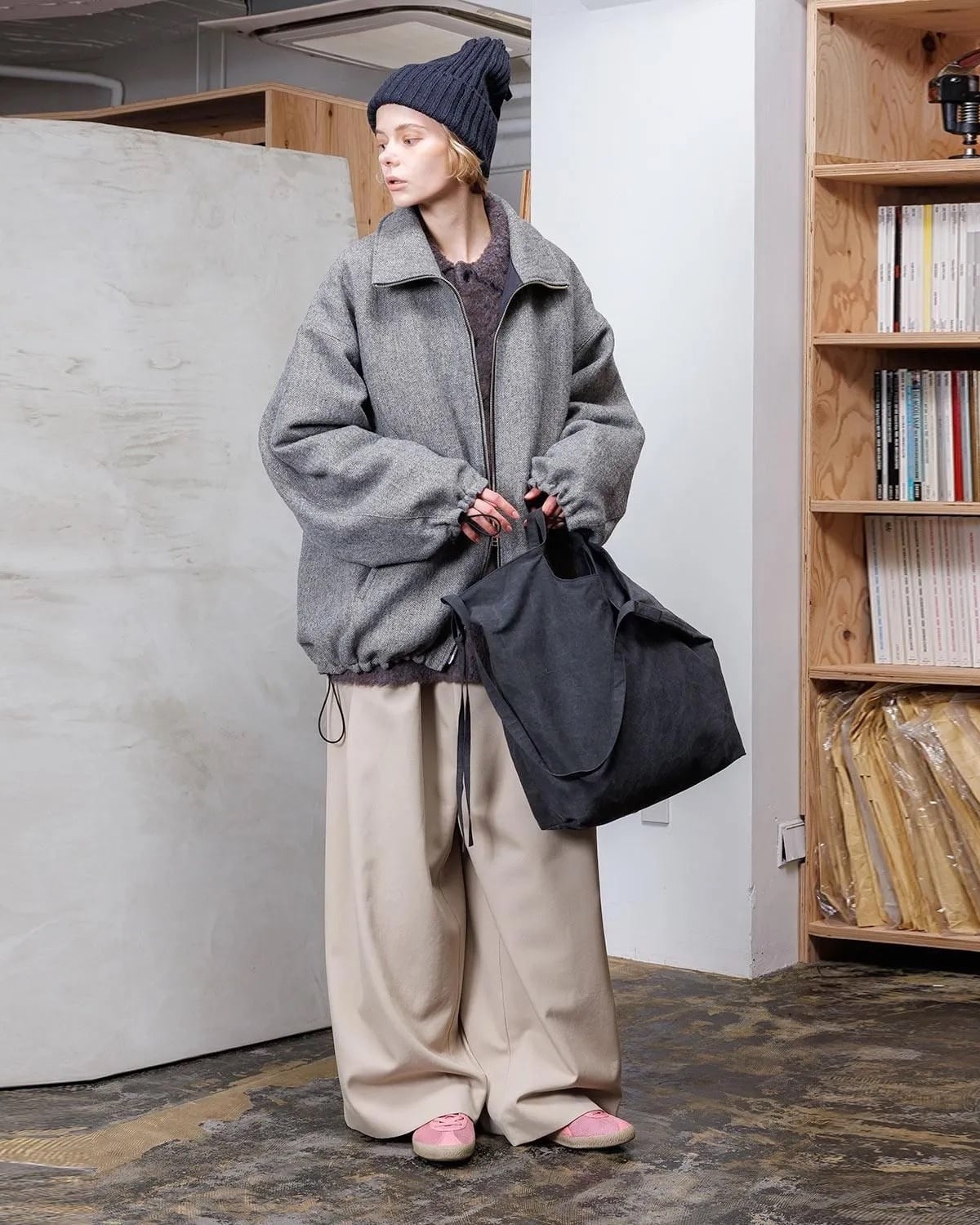 ドロップショルダーの広い身幅に対して、着丈はコンパクトなボックスシルエット。