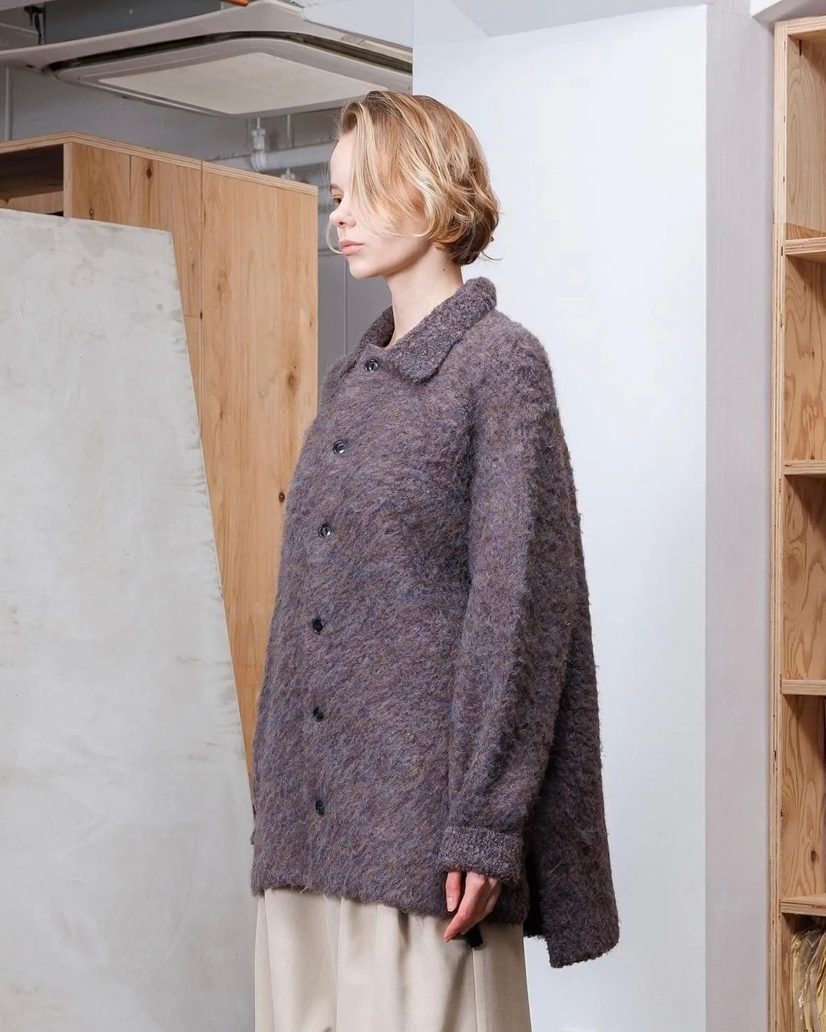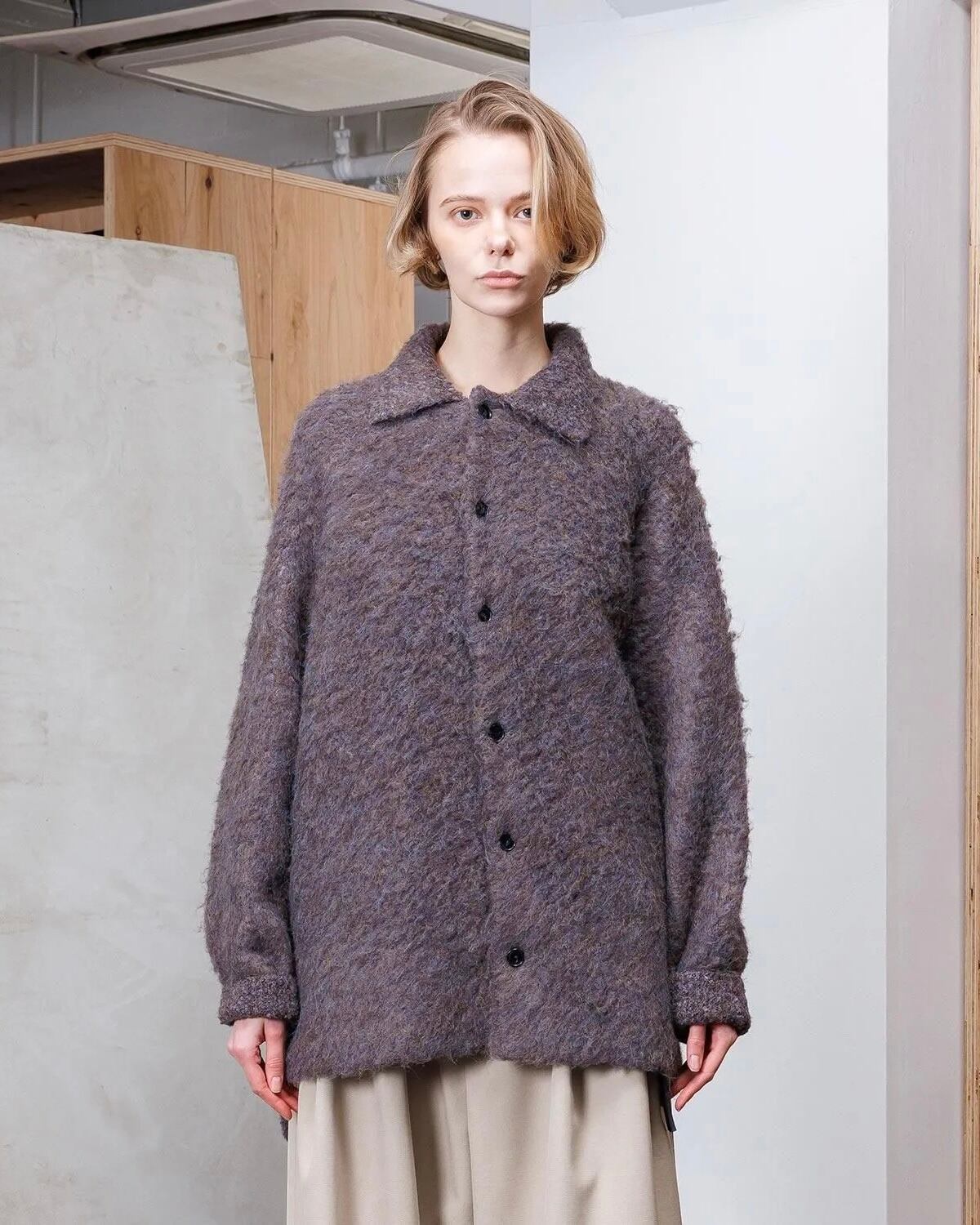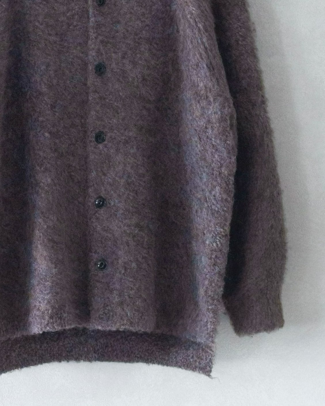 表面を棘のある植物のフラースチーゼルを用いた起毛機で、1枚1枚手作業でふんわりと仕上げられたニット素材です。