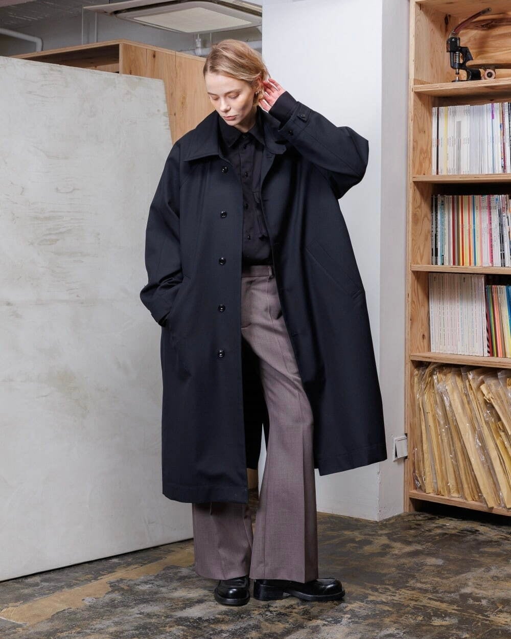 緩やかなカーブを描くラグランスリーブに、オーバーシルエットに設定されているので、インナーにスーツやジャケット、ボリュームのあるニットなども違和感無く着用して頂けます。