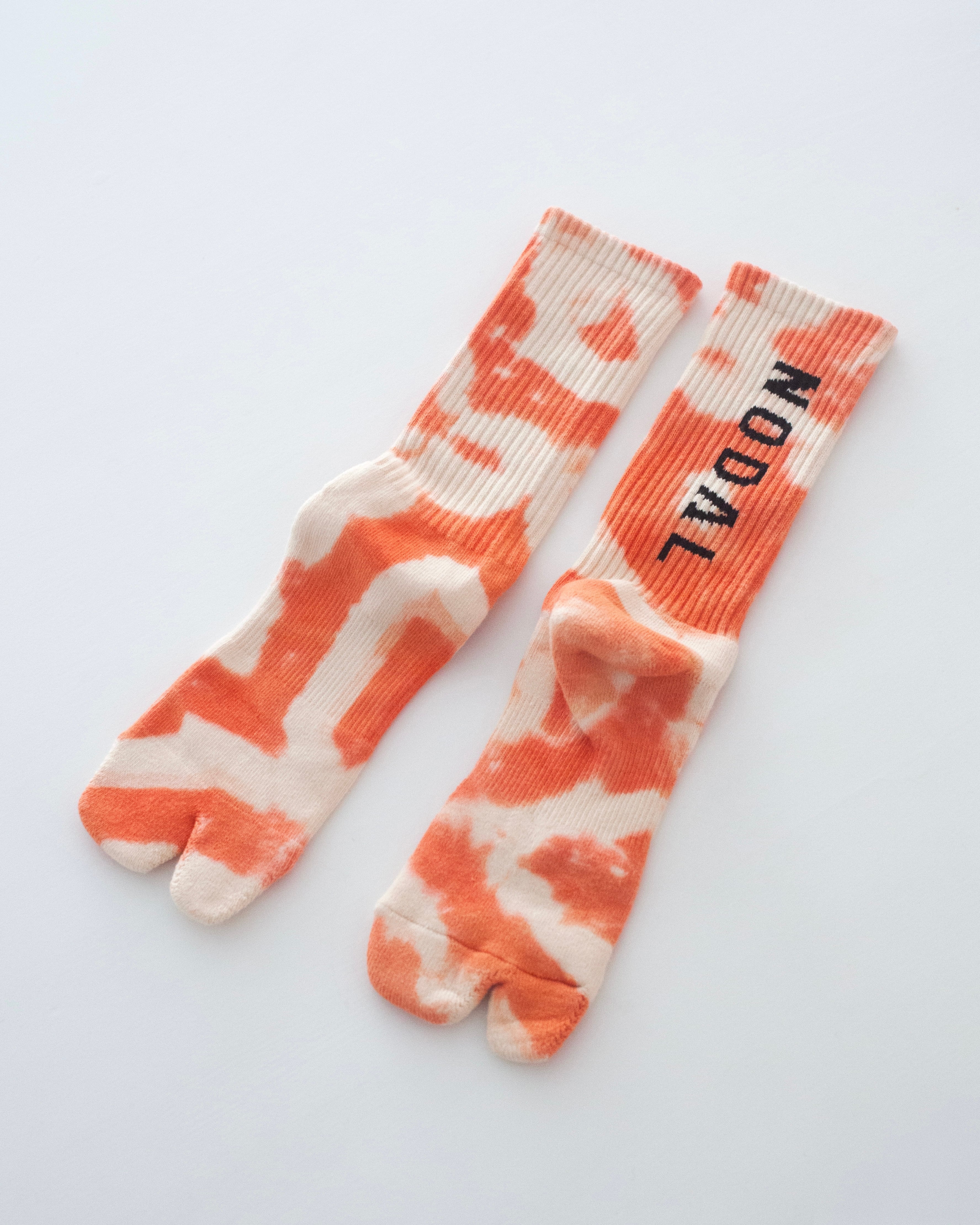 「NODAL」のロゴを背面に施したアイコニックな足袋ソックスに、職人の手作業によるタイダイ染が施されたニーモデル。