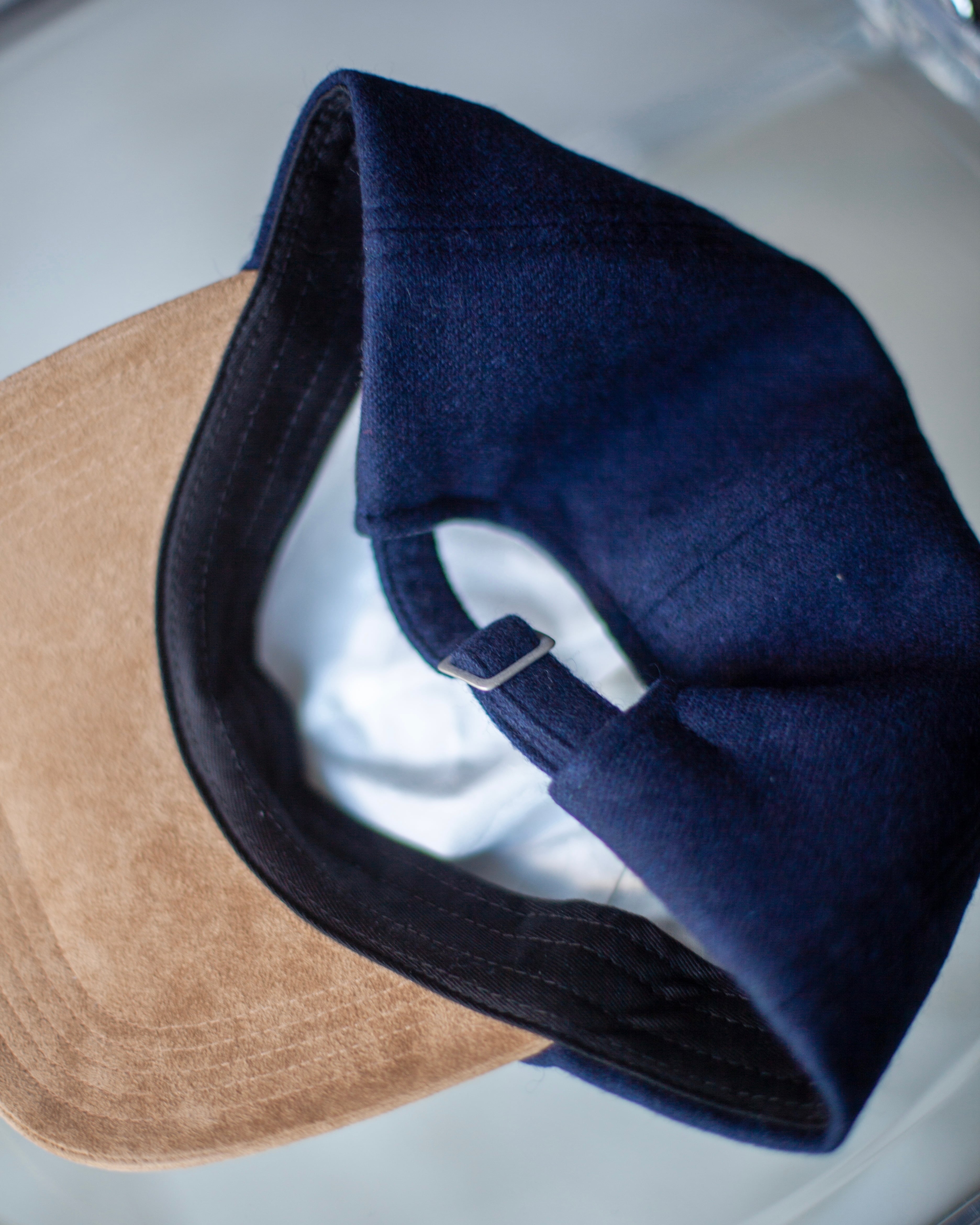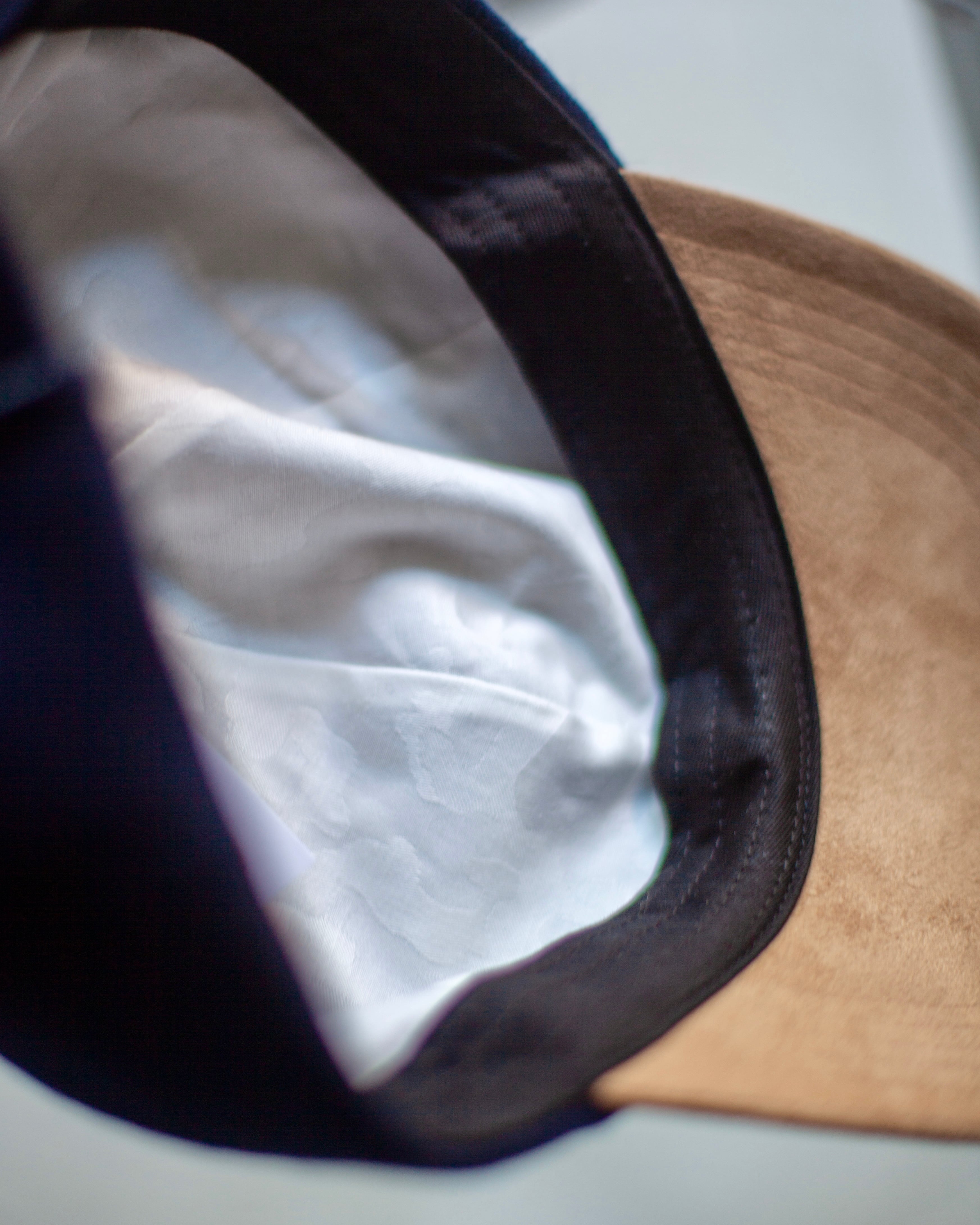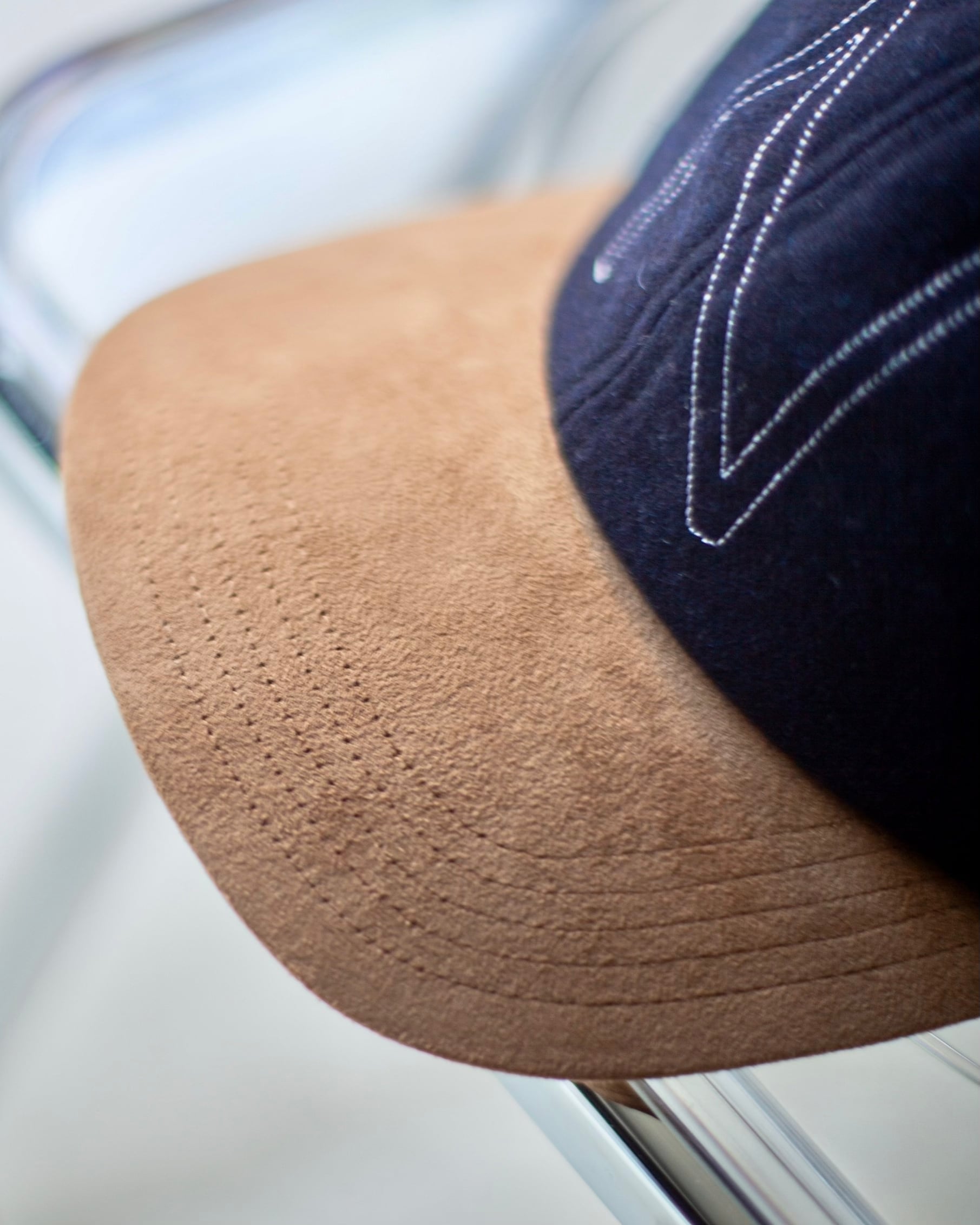 ツバにはリアルな質感のフェイクスエード生地を使用。