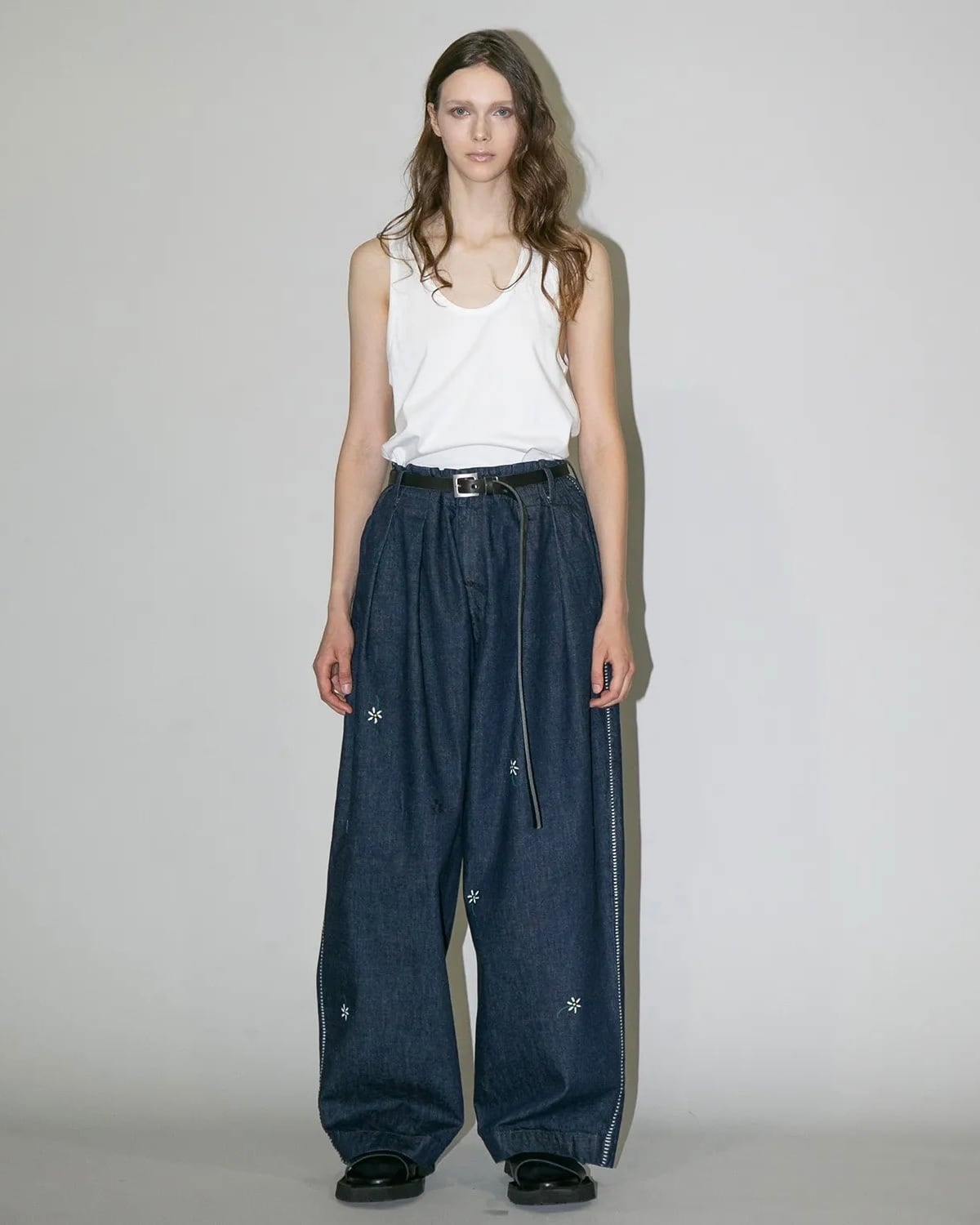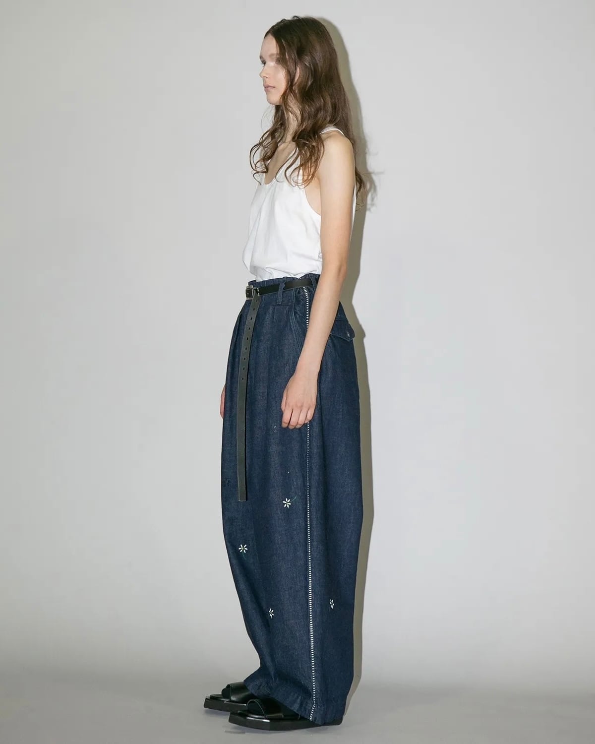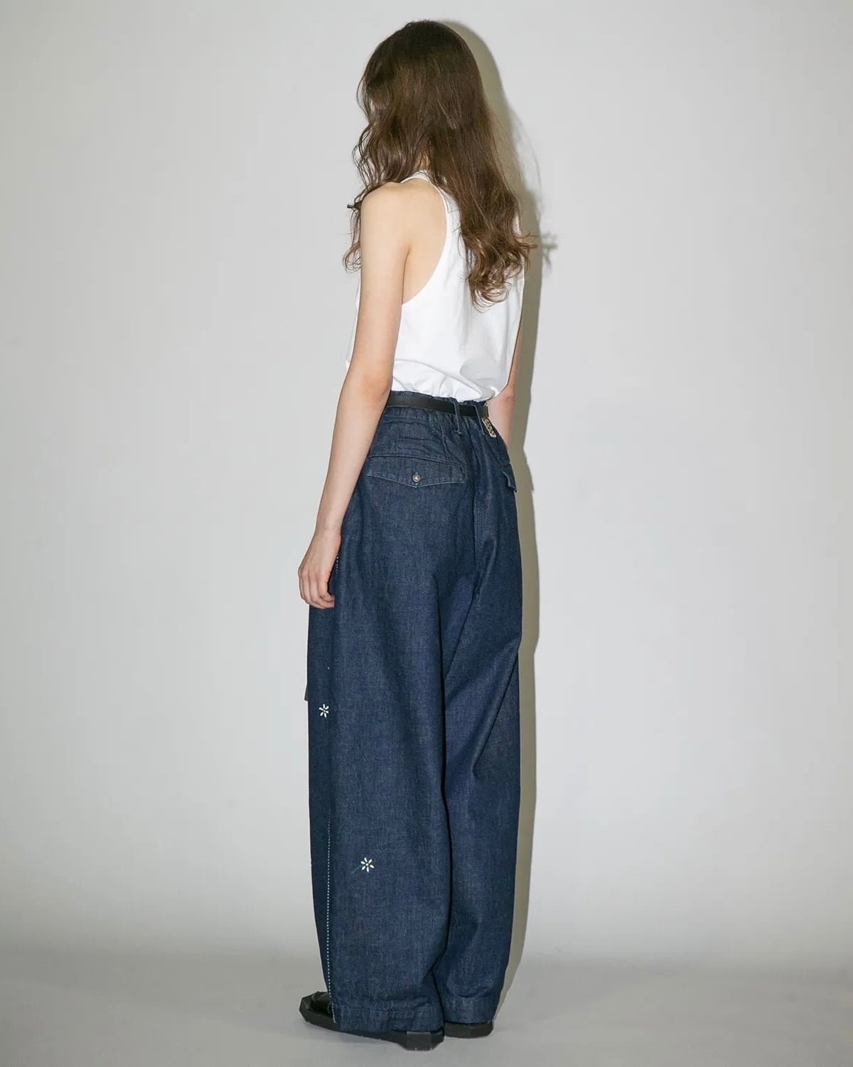 ハイウエストの位置でベルトで絞り穿いていただくと、ウエスト、レングス共にすっきりとした印象になり、デニムアイテムながらスラックスライクにご着用頂けます。