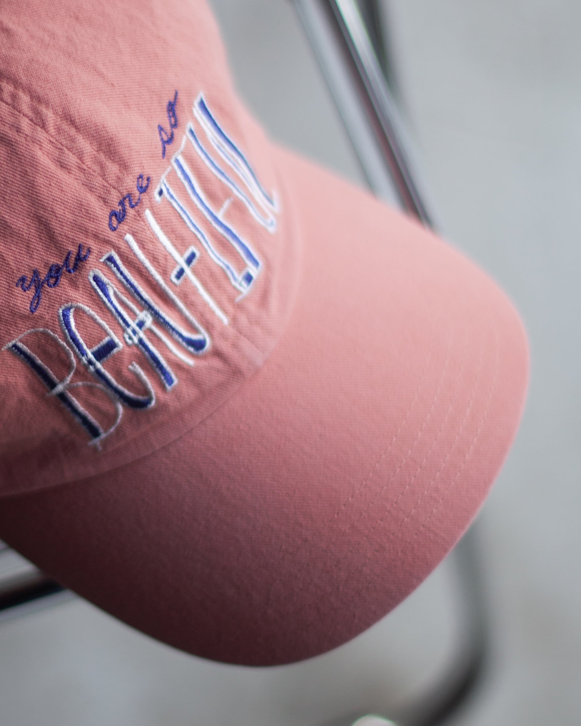 印象の異なる手書きのロゴ刺繍がポイントのベースボールキャップ。