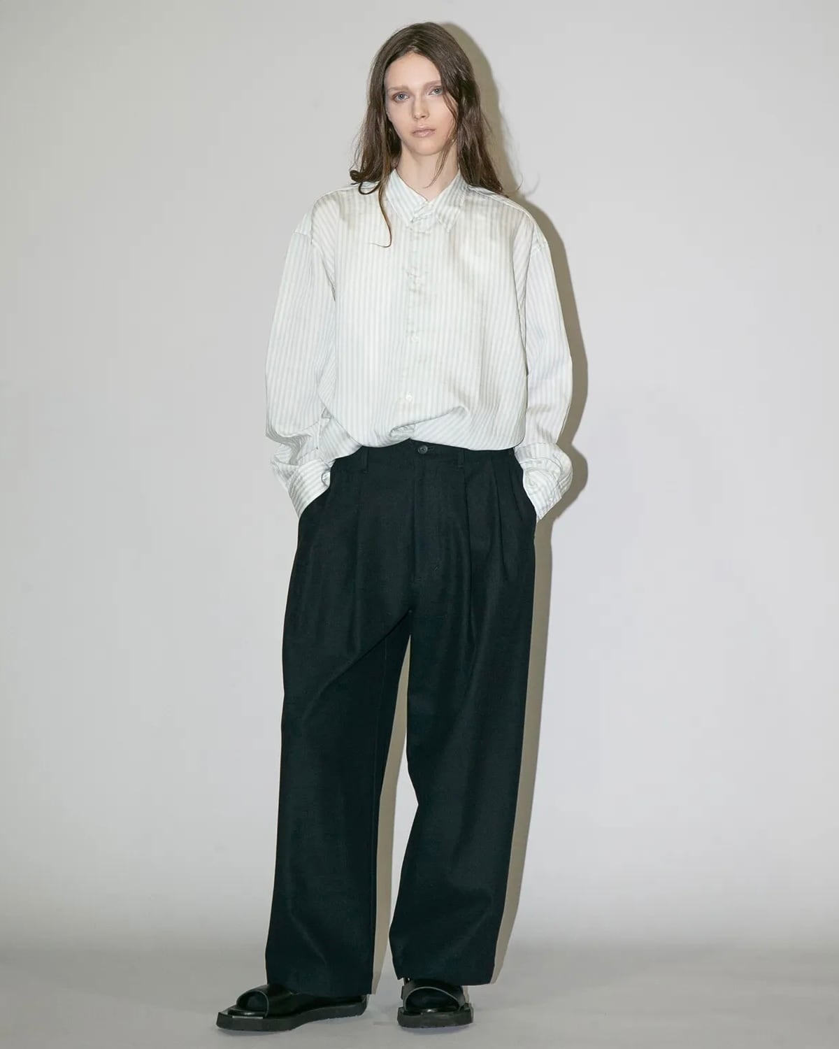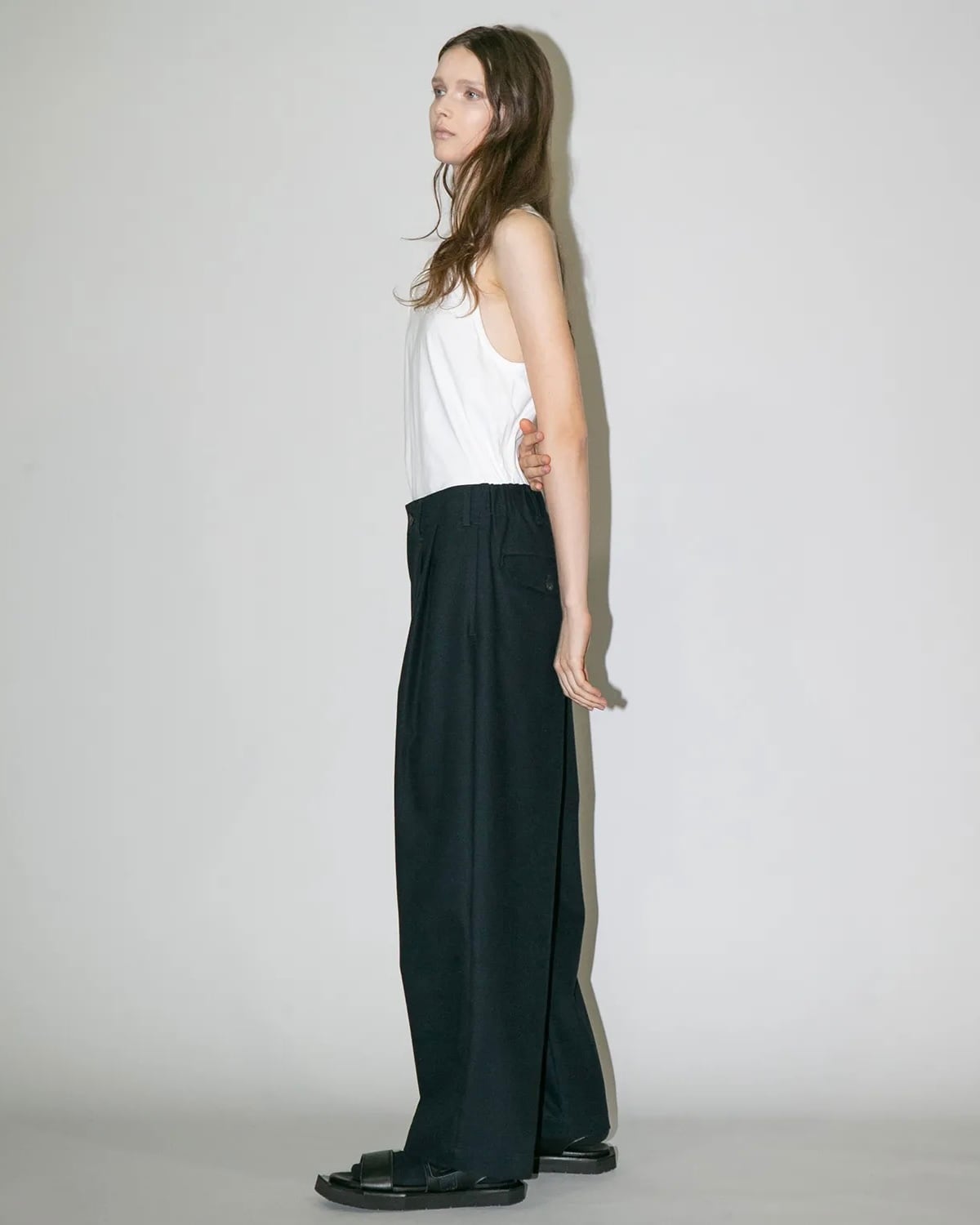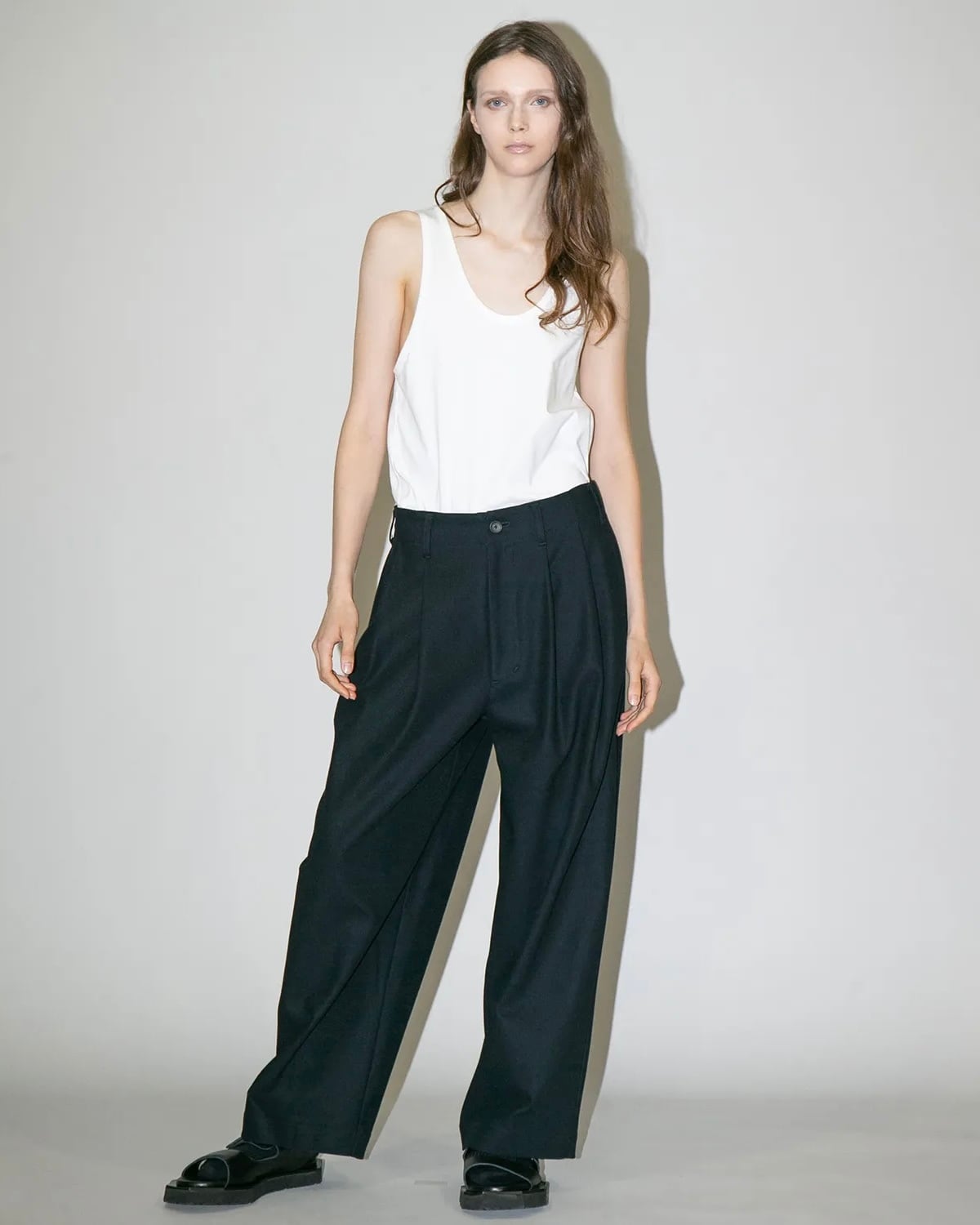 フロントに2タックのソフトにテーパードが効いているワイドシルエット。