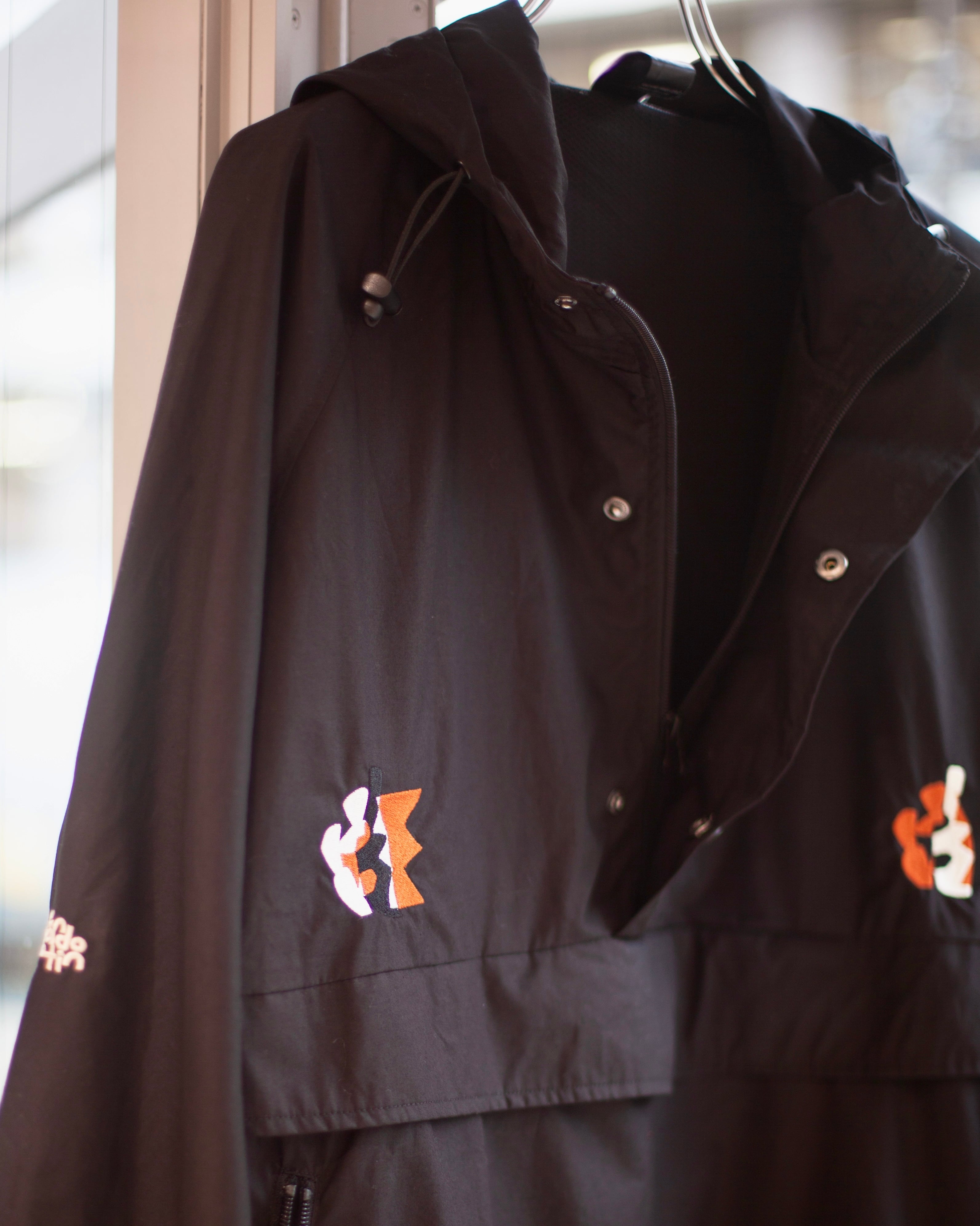 フロントはジップとスナップボタン、フード脇と裾にドローコード付き。