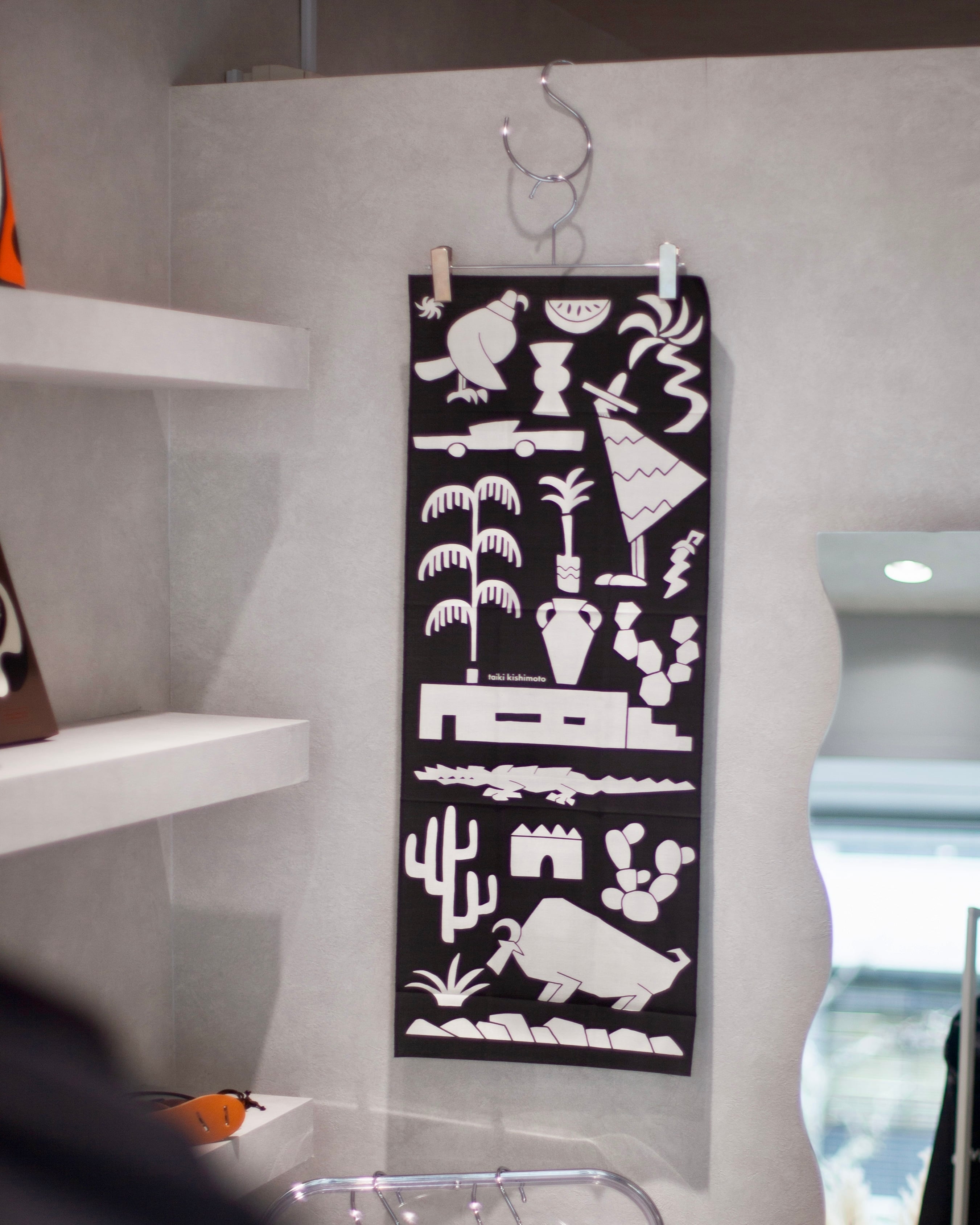 異国を旅して出会う様な動物や植物、建物をモチーフにしたshapeが組み合わさったデザイン。