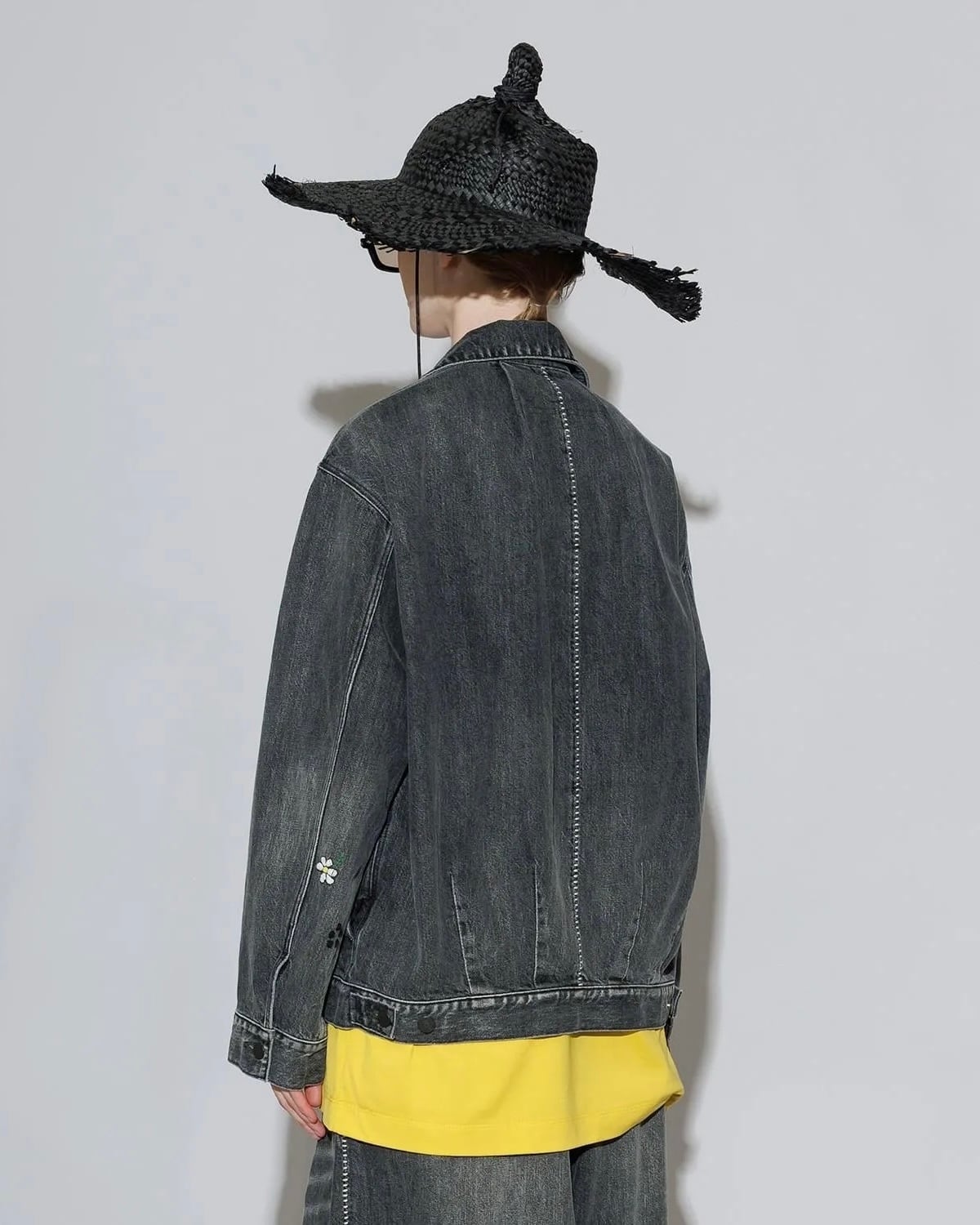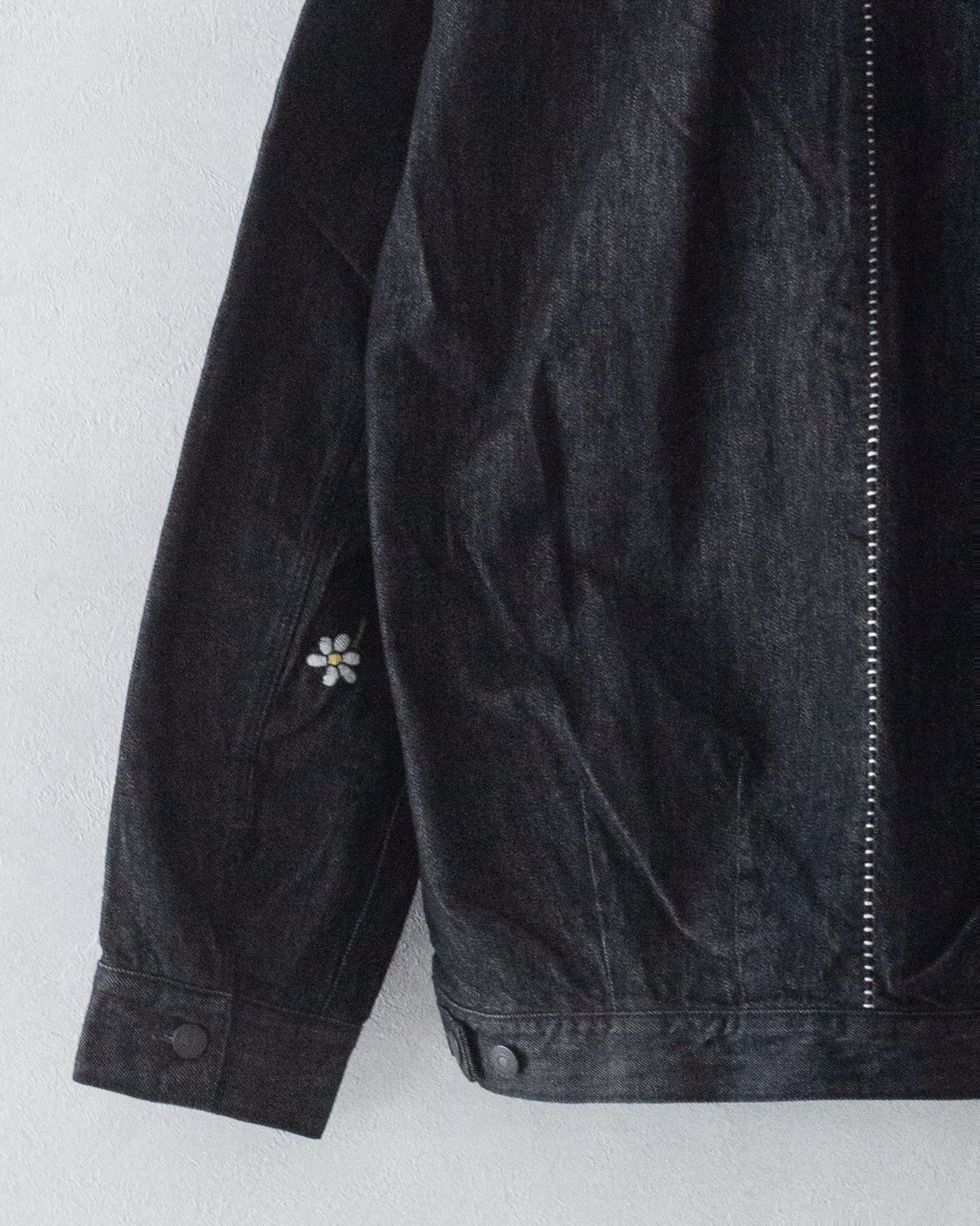 左袖の、カスミソウをイメージした手刺繡を、無骨さを抑えつつワンポイントのアクセントに。
