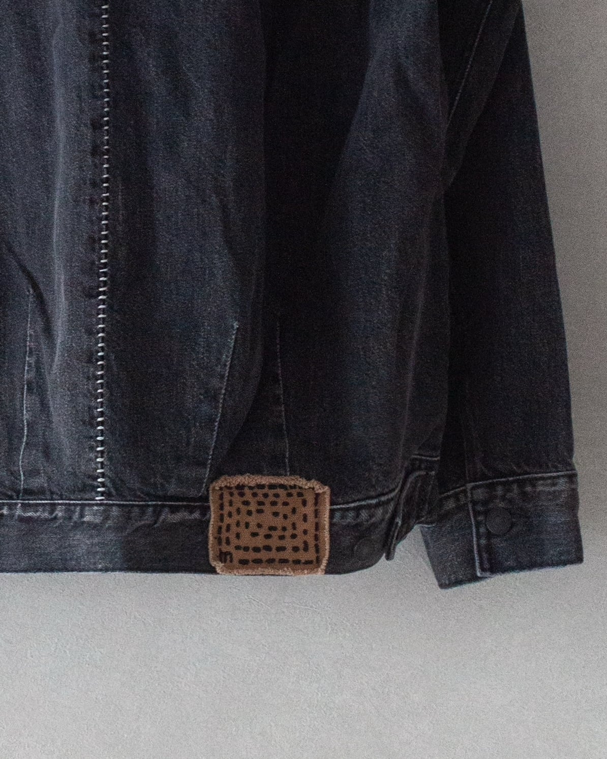 本来、巻き縫い仕様が用いられる部分には、特殊なミシンを採用し、ハシゴまつり縫いのように仕上げ、オリジナルのパッチには、点描技法を刺繍で表し色や構成を新しい形でキャンバスで表現されています。