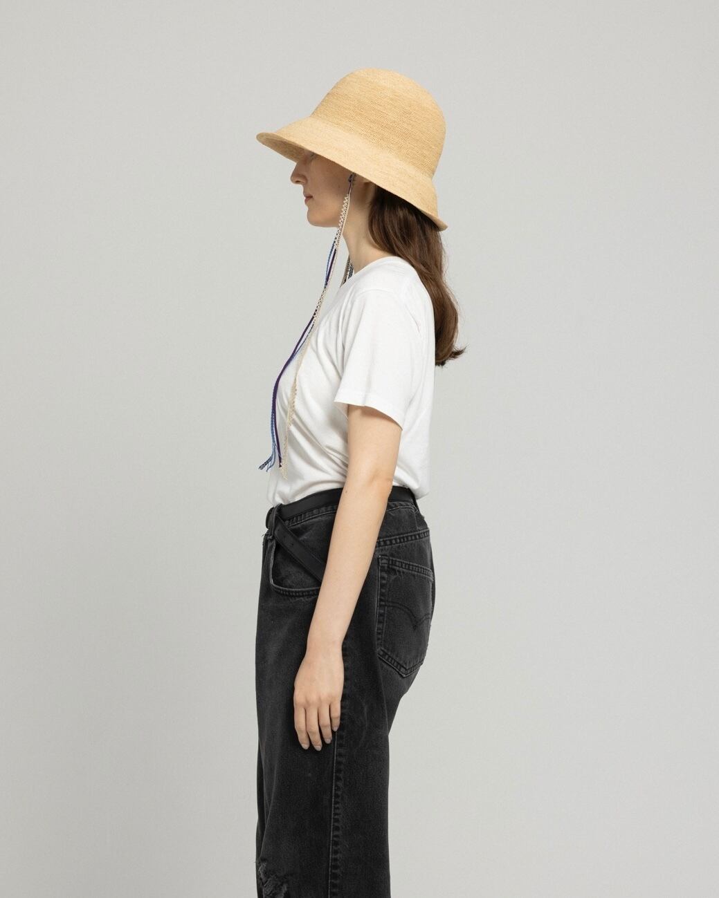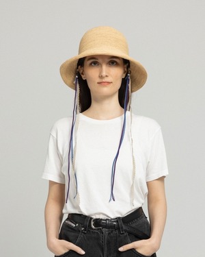 あご紐には、異なる素材を組み合わせた3色のオリジナルリボンを使用。さりげない配色のコントラストが、スタイリングに程よいアクセントを添えます。