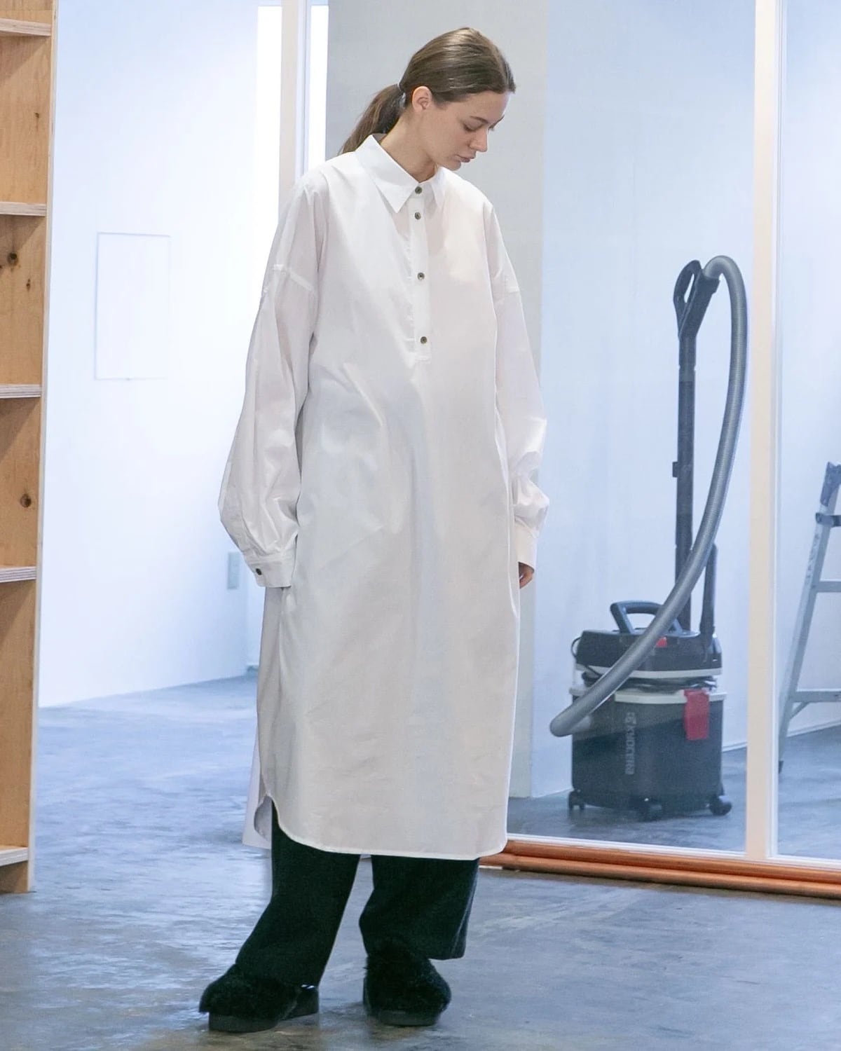 ロング丈のオーバーサイズシルエットが特徴のプルオーバーシャツ。