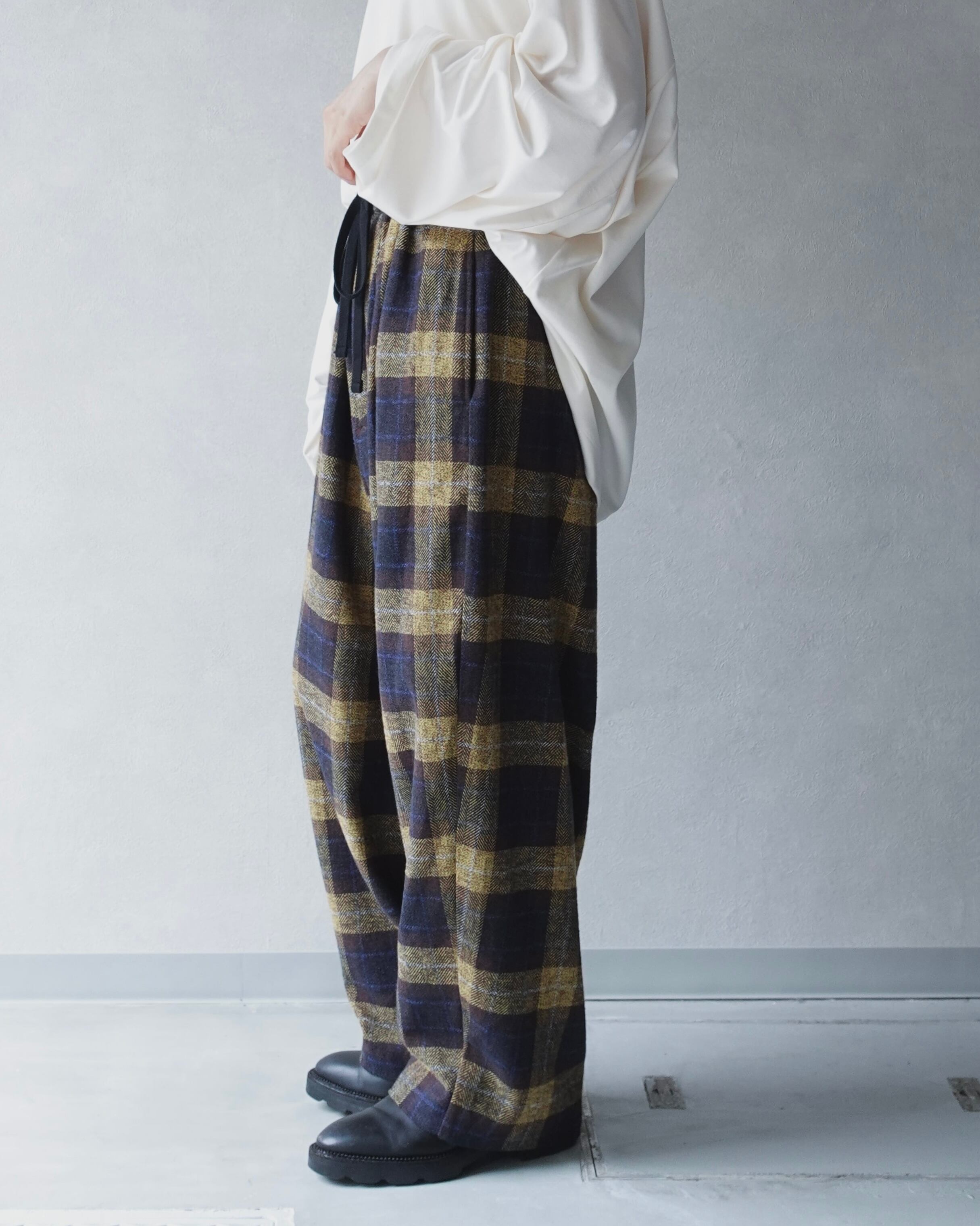 チェックの柄とレトロな色合いがスタイリングのアクセントになってくれるイージーパンツ。