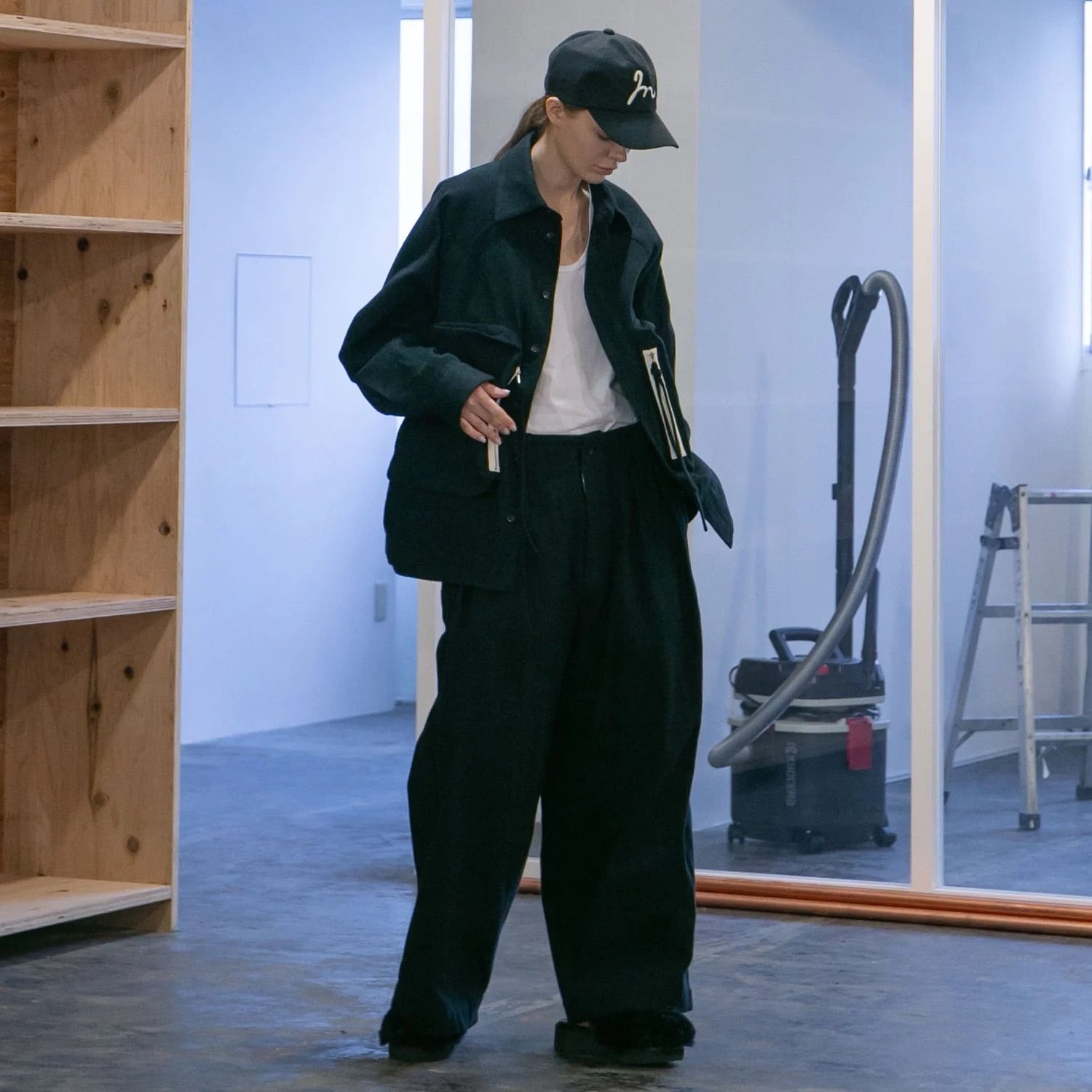 ワイドシルエットがキレイに演出されるすっきりとした腰回りのバランスとディテールがポイント。